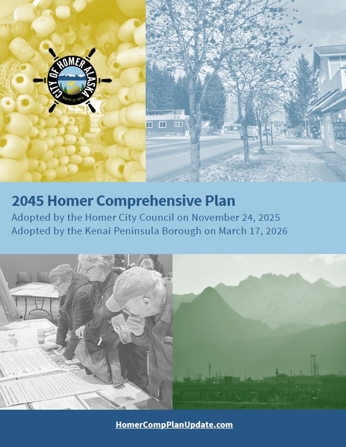 - March 17 | Following a public hearing, the Kenai Peninsula Borough adopted the 2045 Homer Comprehensive Plan (Ord. 2026-04) during their regular assembly meeting. Borough adoption incorporates the City’s plan into the broader borough planning framework, consistent with its jurisdiction over land use planning.